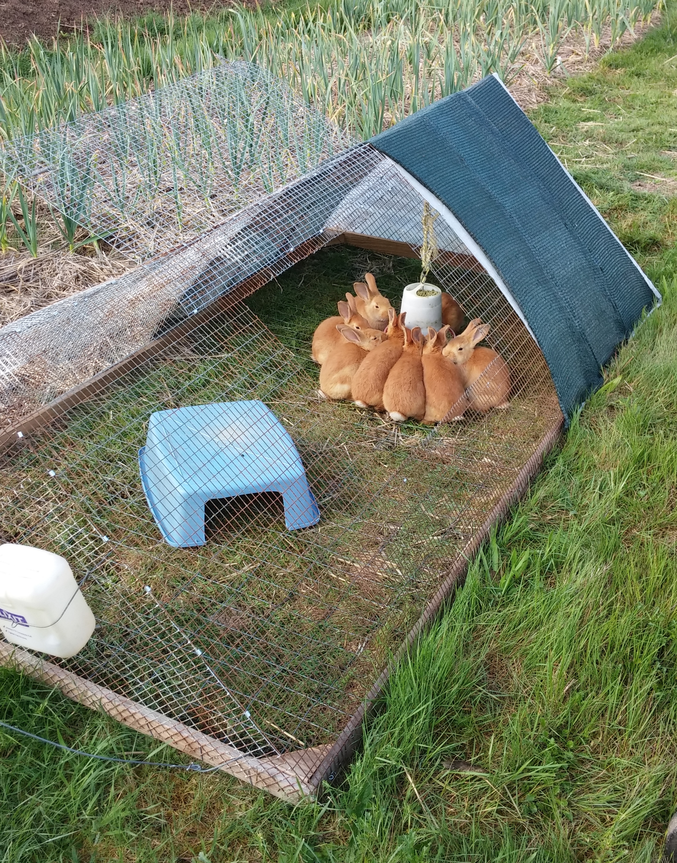 Pastured rabbits enjoying their pellets