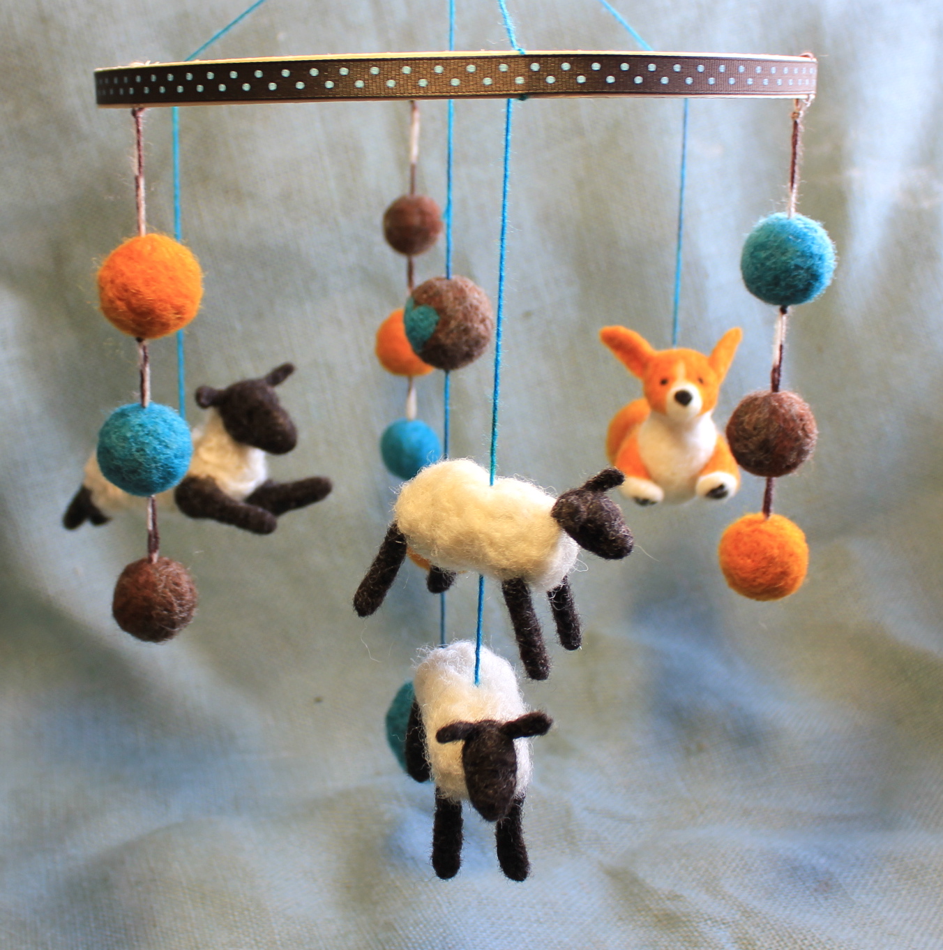Corgi herding a ewe and her lambs – A felted baby mobile by Fiber Friends